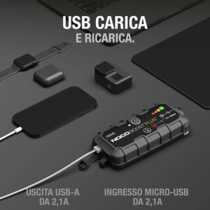 Multifunzione: è un avviatore di emergenza per auto, una power bank portatile e una torcia a LED. Ricarica smartphone, tablet e altri dispositivi dotati di porte USB. Si può ricaricare facilmente in 3 ore tramite qualsiasi porta USB a 2,1 A. È inoltre provvisto di una torcia a LED integrata da 100 lumen con sette modalità di illuminazione, tra cui una luce stroboscopica di emergenza e SOS.